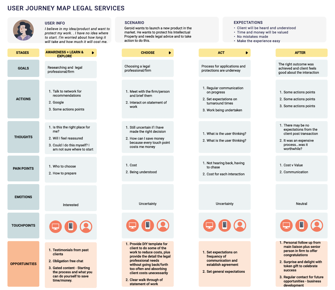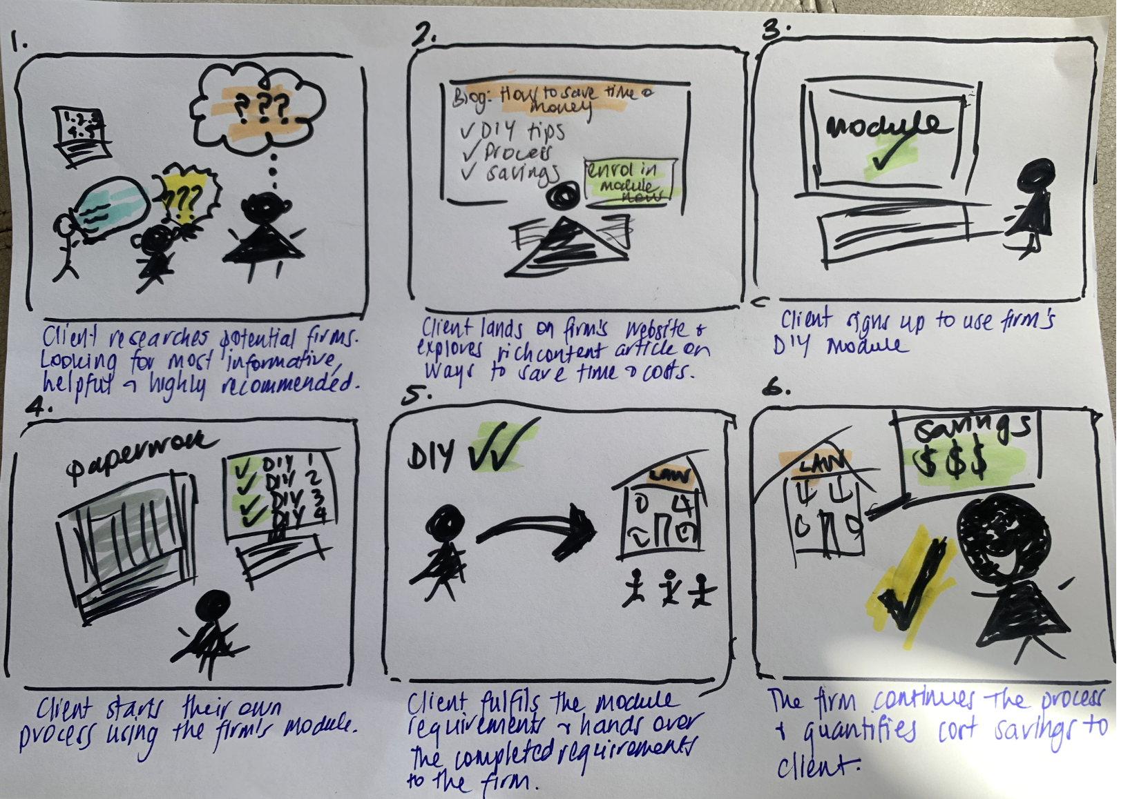 How might we improve the client journey for a legal services provider to foster rapid trust-building? Most times people are bamboozled by legalese and the experience of engaging and interacting with a law firm. The challenge was to better understand how to improve value for clients; to build connectedness; navigate them easily through the transaction, and be front of mind when they next need legal services.