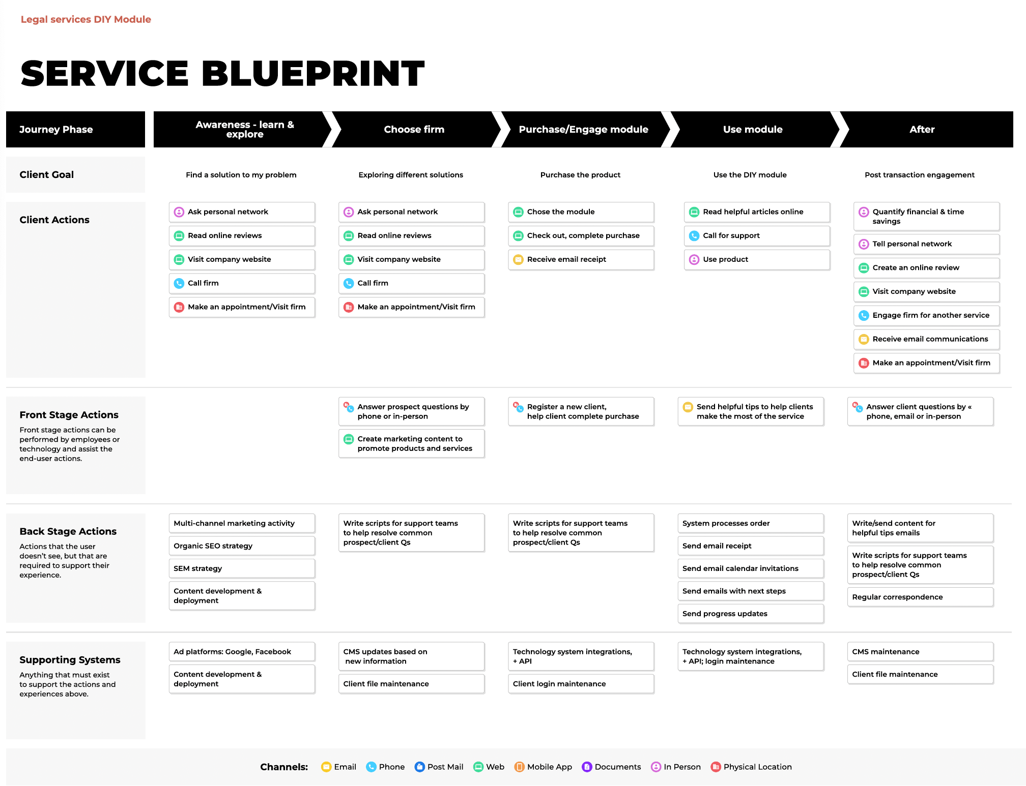 The blueprint was created in close collaboration with staff from the firm, which helped to incorporate perspectives from across the organisation. It was an essential tool to communicate, share understanding, and build alignment around new service ideas and identify the key moments that matter to a client and where the focus should be for achieving some quick wins.